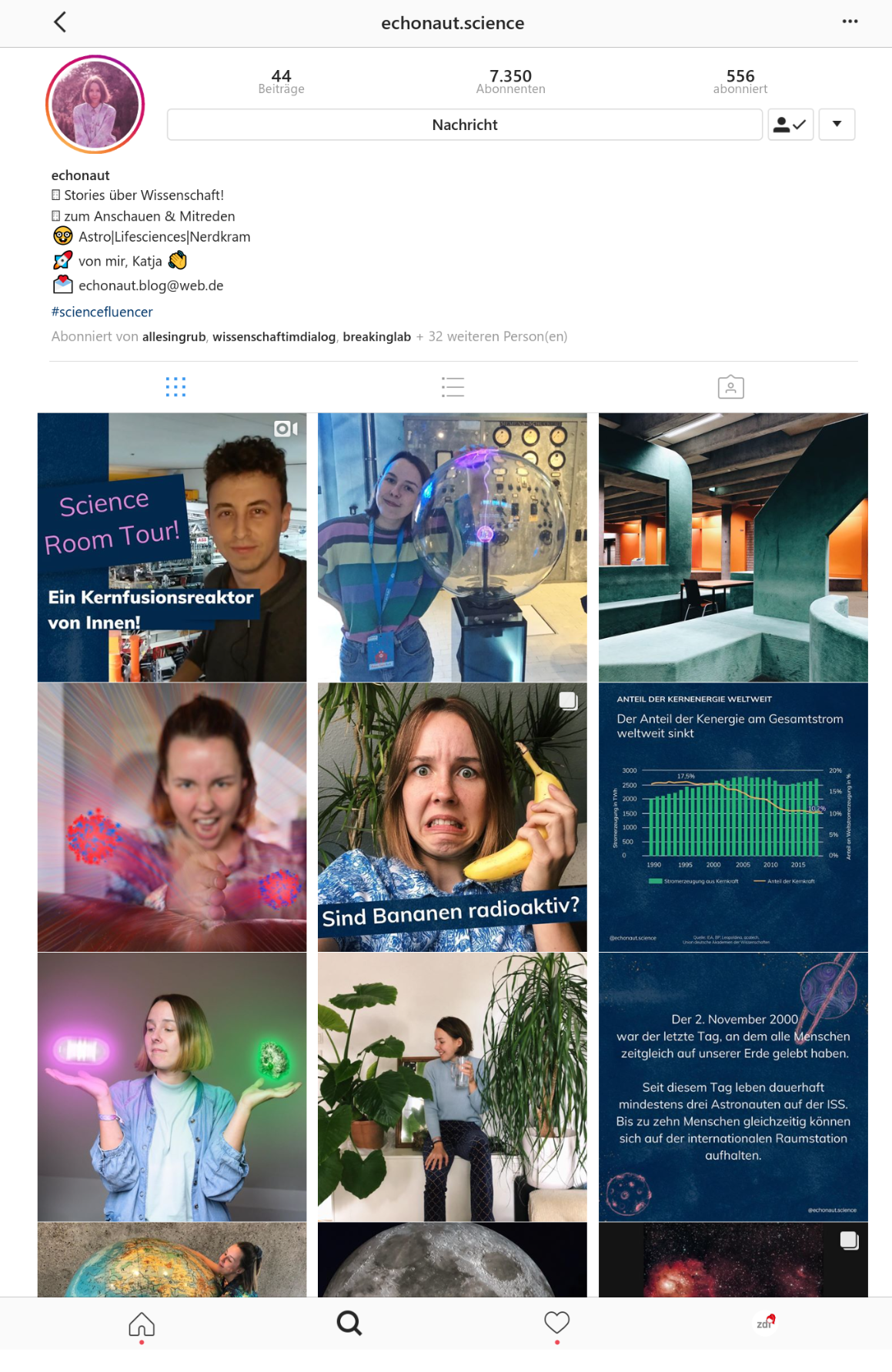 Katja Sterzik: Neues Wort für euch! MINT-fluencer*innen! 😀 Mein Tipp ist einfach: Legt los und denkt nicht zu viel nach! Das wichtigste ist, einfach erstmal anzufangen. Ich habe mich super lange daran aufgehalten zu überlegen: Wie könnte mein Logo aussehen? Welches Design möchte ich? Das sind alles Dinge, die einen Account aufwerten, aber wenn diese Überlegungen dazu führen, dass ihr die ganze Zeit rumplant anstatt einfach mal anzufangen, dann arbeiten diese Gedanken wieder gegen euch. Außerdem: Seid kreativ! Es gibt eigentlich keine Kochrezepte dafür, wie man Instagram zu machen hat. Die App wandelt sich so unglaublich schnell und gibt einem gleichzeitig so viele Möglichkeiten, sich kreativ auszuleben und auszuprobieren! Traut euch einfach und macht was verrücktes! Dann seht ihr für euch, euren Account und für eure Community, was am besten funktioniert.